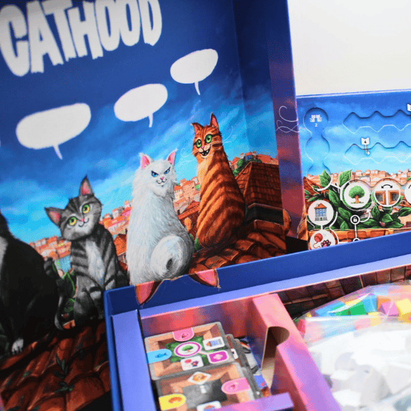 La première chose, quand on illustre un jeu, c’est de bien le comprendre. Lire les règles, s’imprégner de l’univers s’il y en a un, jouer au prototype si possible, et proposer une direction artistique générale. Pour moi, c’est un bon point de départ : déterminer quel composant du jeu est le protagoniste, car cela influence ensuite le style de tout le reste. Pour moi, les chats étaient les personnages principaux, et c’est par là que j’ai commencé. J’ai aussi trouvé utile d’imaginer physiquement un endroit réel dans le monde où se déroulerait le jeu.